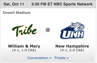 Number 10 versus number 4. It doesn’t get much better than that. A well-rounded Tribe team will take on the New Hampshire Wildcats, an offensive power in the FCS. W&M is coming off the bye week with a mighty 4-1 record, and UNH, also 4-1, is riding high after a 2-0 start to CAA play–with wins over the lowly Elon Phoenix and against a strong Richmond Spiders team.