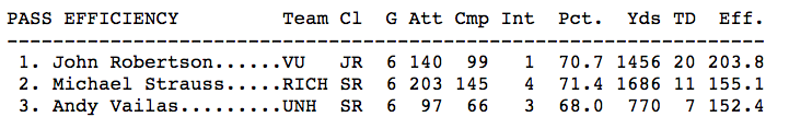 John Robertson leads the CAA in Pass Efficiency (via The Sports Network)
