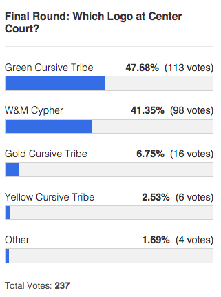 A few weeks after the initial announcement, Tribe Athletics has finally released pictures of the new and improved basketball court in Kaplan Arena! Leading up to its release, we at the W&M Sports Blog polled you, the fans, over the last couple days about which logo you would like to see at center court. After 200 votes were cast, it came down to two logos: a Green Tribe logo or the W&M Cypher. The Green Tribe logo narrowly beat out the W&M Cypher by a voter tally of 113-98.