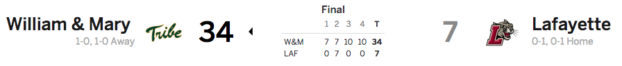 Around the CAA: William & Mary and JMU were the only two teams in the entire CAA to acquire a win this past weekend. To be fair, W&M and JMU played FCS foes, whereas the vast majority of the CAA played against bigger and better FBS opponents. But we’ll take it, because why not?