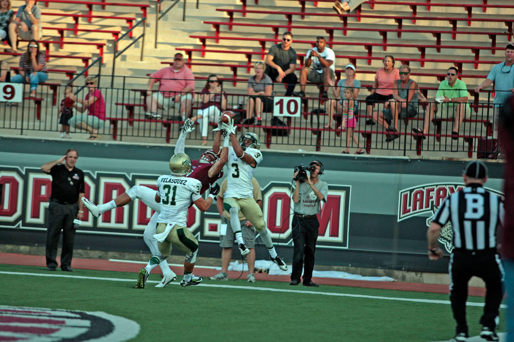 While the defense did not record any sacks, as previously stated, the unit did come down with two big-time interceptions. Lafayette tested the Tribe corners early, knowing that they had an impressive big size advantage on the outside. This led to Lafayette lobbing up an early jump ball to the end zone, but fortunately for the Tribe, 5’10” CB Aaron Swinton went up and intercepted the ball over a much taller 6’4″ receiver. Swinton (now number 3), showed off his abilities both as a corner and as a returner, and added 4 tackles to go along with his interception in this contest.