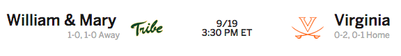 - Efficiency from the passing game: Quarterback Steve Cluley will need to keep the Tribe offense on schedule as they try to keep pace with the Cavaliers. This means a high completion rate, and most importantly, 0 turnovers. FCS teams only upset FBS teams if they win the turnover battle. The Tribe cannot afford turnovers in this game if they hope to pull off the upset. Against a decent Virginia defensive line, the Tribe’s stellar offensive line has to provide time for Cluley to find open receivers, as well as open holes in the running game. This will be the biggest test of the year for W&M’s offensive line, which has been touted as the strongest position unit on the team this year.