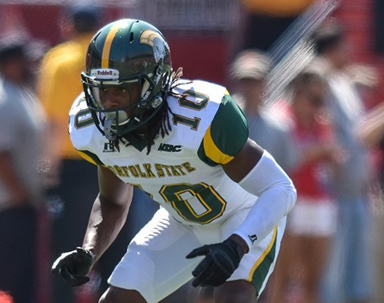 #10 DB Sandy Chapman is a ballhawk, who not only forces interceptions, but also leads the team in total tackles. [photo via nsuspartans.com] - #10 Sandy Chapman (DB, Senior, 5’10”, 180 lb): Another transfer, Chapman found himself at ODU for the first two seasons of his collegiate career before transferring to Norfolk State entering his junior season. Last year as a junior, Chapman started in all 11 games for the Spartans, ranking fourth on the team in total tackles. Chapman undoubtedly has a nose for the ball and knows how to wrap up. He already leads the team in tackles this year, as a defensive back nonetheless, with 15 total tackles. He also has an interception to his name. Chapman will have his hands full this week against DeVonte Dedmon, Jack Armstrong, and the rest of the Tribe’s receiving corps. However, #10 is no pushover. Look for him to be around the ball often on Saturday.