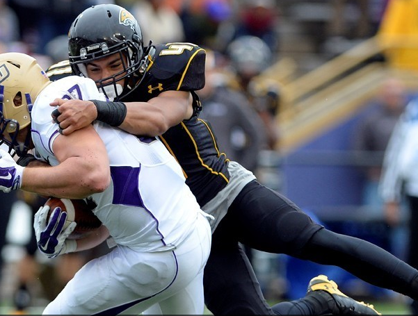 OLB Jordan Mynatt can do a little bit of everything, shown here taking down JMU’s elusive QB Bryan Schor. [photo: towsontigers.com] - #41 Jordan Mynatt (OLB, Redshirt Senior, 6’2″, 209 lbs): Mynatt is what we would call a stat sheet stuffer. He ranks 4th on the team in tackles with 53, and leads the team in tackles for loss with 6.5 on the year. He also has 2 sacks on the season, a forced fumble, and an interception. Basically, Mynatt is all over the field and can quite literally do it all. He will look to stop the best functioning part of the Tribe offense on Saturday, that being Tribe RB Kendell Anderson. It’ll be a fun time watching these two go at it this weekend; naturally, we’re thinking Kendell comes out on top.