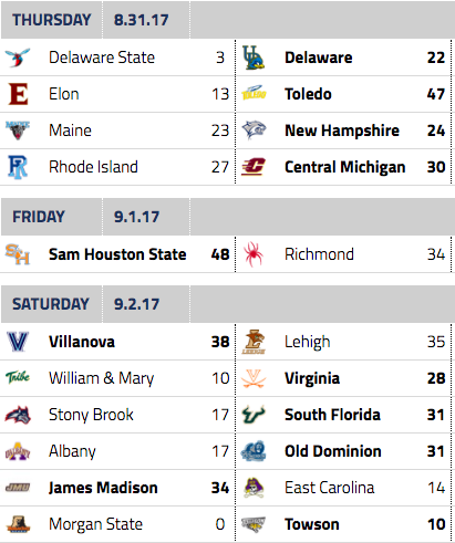 Stony Brook held a lead over #19 ranked USF for most of the game before losing it in the 4th quarter, but it was quite the showing for the Seawolves nonetheless. We are also impressed with how Rhode Island performed against FBS Central Michigan, taking them to 3 OTs before ultimately losing. It will certainly be another exciting year in the CAA!
