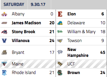 Albany narrowly lost to the Tribe’s upcoming opponent, the Elon Phoenix — who look much improved from a season ago. JMU knocked out Delaware in a closer-than-expected contest. Villanova unsurprisingly knocked out the lowly Towson Tigers, and New Hampshire rolled at home over Bryant. Maine’s game against UCF was cancelled/delayed, and the Rhode Island Rams fell to Brown on the road.