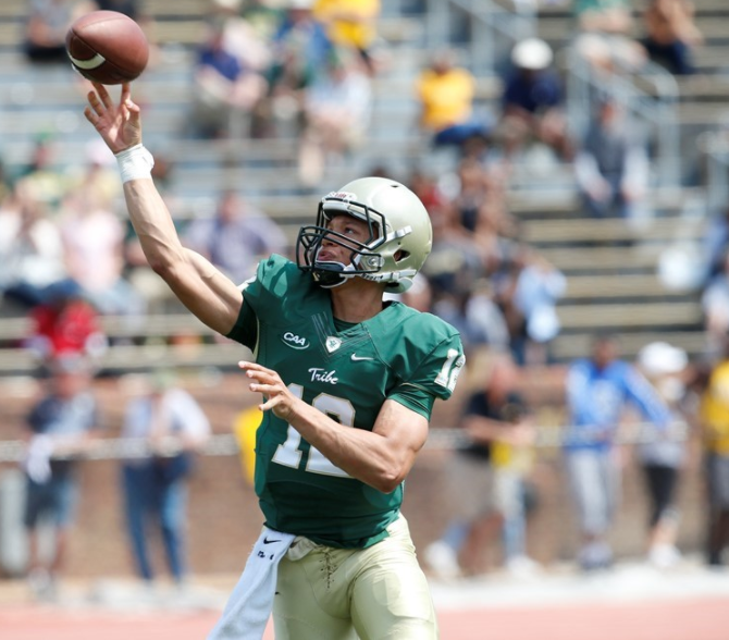 Virginia High School League’s all-time leading passer, Shon Mitchell made his collegiate debut on Saturday, as Jimmye Laycock decided to shed his redshirt. [photo via Jim Agnew, tribeathletics.com]