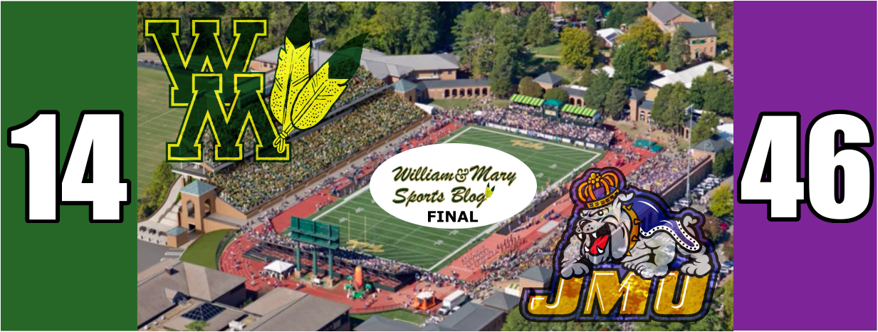 Well, that wasn’t fun. In front of a sold out Homecoming crowd, W&M was absolutely obliterated by the visiting #1 JMU Dukes, losing by a score of 46-14. It was one of the worst offensive performances we at the Blog have witnessed from a Jimmye Laycock-led team. The scoreboard actually appeared better than it was, if you can believe that, as the Tribe scored two late TDs in garbage time for its only points of the game. W&M has now lost its fourth straight contest, and remains winless in conference play, 2-5 (0-4 CAA). Sigh.