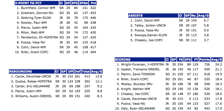 Northeastern proved itself as perhaps the most balanced team in the CAA, not only finishing with a share of the regular season title, but also ranking toward the top 3 in both offensive and defensive categories, including: scoring defense, assists, 3-point FG pct, overall FG pct, and free throw pct. The Towson Tigers finished with the 4th highest scoring offense (76.8 points per game) to go along with the #1 ranked FG pct defense (with opponents shooting just 42.9% per game). And Hofstra, one of the most prolific teams in the league, unsurprisingly averaged the 3rd most points in the league at 79.2 per game.