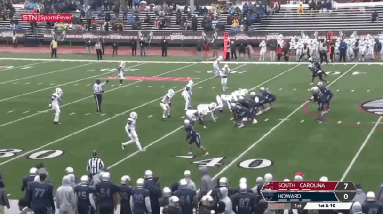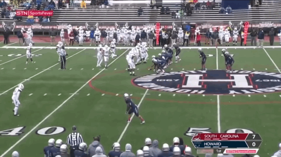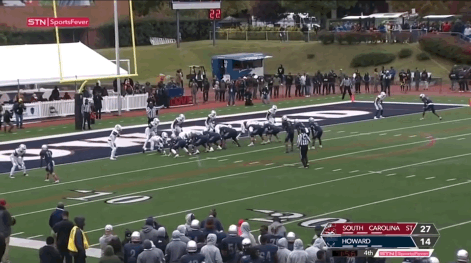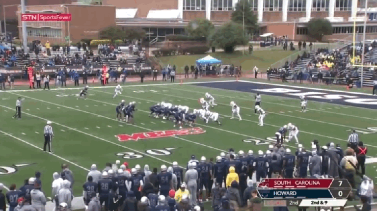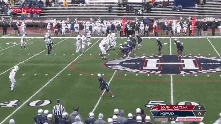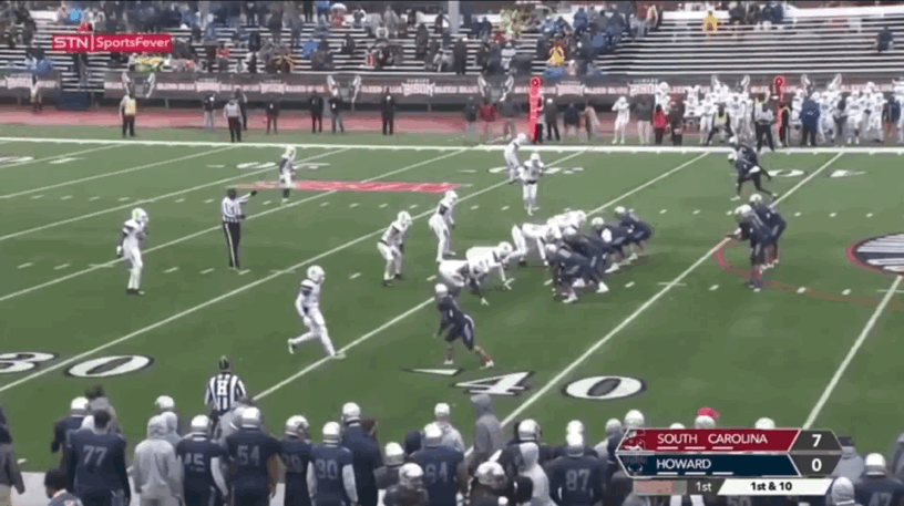 Again, I don’t think we’ve ever seen a look where both running backs are on the same side of a quarterback, but that’s how Howard lined up in this play. Throughout the course of the play, one running back goes straight ahead toward the line, while the other goes to the outside looking for a pitch. In this situation, the QB has several options: first, he can hand it off to the running back going straight ahead; second, he can fake the handoff to the running back, and keep it himself; third, he can pitch it to the running back going outside (essentially, your classic triple option). But fourth, he could fake the handoff and pass the ball. So, count ’em, that makes four different options that opposing defenses have to plan for on one play. While this play ended up stuffed at the line, it keeps defenses on their toes — and serves to open up the passing game in the long-term.