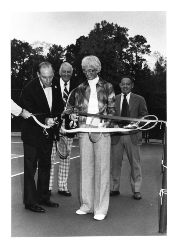A photo of Cornelia Storrs Adair, class of 1923. A student at William & Mary from 1921-1923, Adair was a member of Phi Beta Kappa in 1927, and the first woman recipient of the Alumni Medallion in 1934. [Source: University Archives Photograph Collection, UA 8.; Creator: College of William and Mary]Cornelia Storrs Adair Tennis Courts Ribbon Ceremony, circa 1976: An image of the Cornelia Storrs Adair Tennis Courts Ribbon Ceremony, circa 1976, with President Thomas Ashley Graves, Jr. on the left. [Source: University Archives Photograph Collection, UA 8.; Creator: William & Mary]