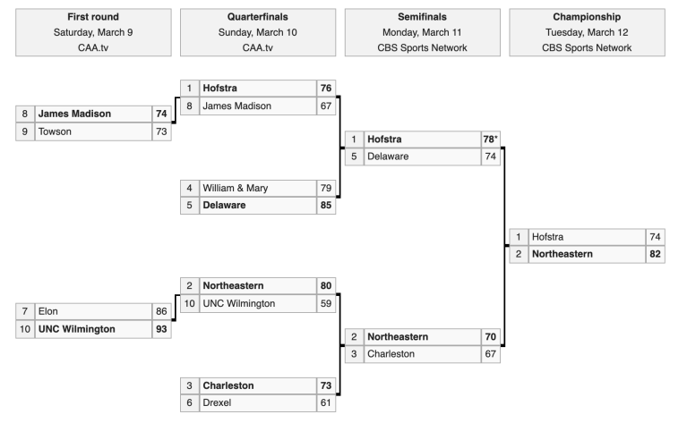The 2019 CAA Tournament saw the Northeastern Huskies upset the #1-seeded Hofstra Pride in the Championship game.