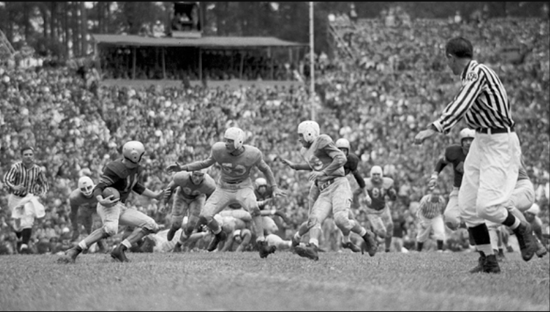 A contest between W&M and #3-ranked UNC in Chapel Hill, North Carolina (1948). In this photo, W&M running back Tommy Korzowski (#14) runs into two UNC defenders. In the end, W&M would shock the nation by pulling off a 7-7 tie.