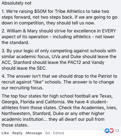 If we stay in the CAA and want to experience sustained, widespread athletic success that matches our high academic standards, we need to either (1) spend more on our teams and/or (2) lower the academic bar on recruiting standards for certain sports. However, if we lower recruiting standards, we know this will slowly eat at W&M’s strong academic reputation — which we know, is above all the most important thing for W&M. By moving to the Patriot, W&M can compete against true peer schools while continuing to maintain high recruiting standards and pay far less for the lower level of scholarships that the Patriot requires relative to the CAA.