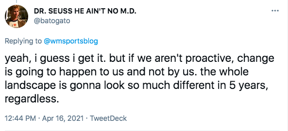 Again, we are not suggesting that W&M abandon the CAA and move to the Patriot League. We are merely providing a counter argument to folks (especially older alums who remember the “glory days”) who say that we should 100% stay in the CAA without even considering potential alternative scenarios and their sustainable benefits. As one of our comrades notes below, the college landscape is going to change dramatically in the coming years; it’s better to have these discussions now, before it’s quite literally too late.