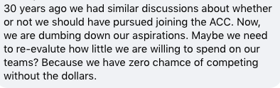 WMSB’s take: Following W&M’s Scandal of 1951 (which we covered extensively in a previous article), there was little chance of W&M joining the ACC when the league formed in 1954. But the above comment brings up an interesting point related to W&M’s financial priorities. We aren’t saying W&M should move to the Patriot League tomorrow and give up on the CAA; we are simply saying that if we stay in the CAA and keep the same recruiting standards & level of financial support for the teams, then W&M will never be a true, sustained power in the CAA across the majority of its sports teams.