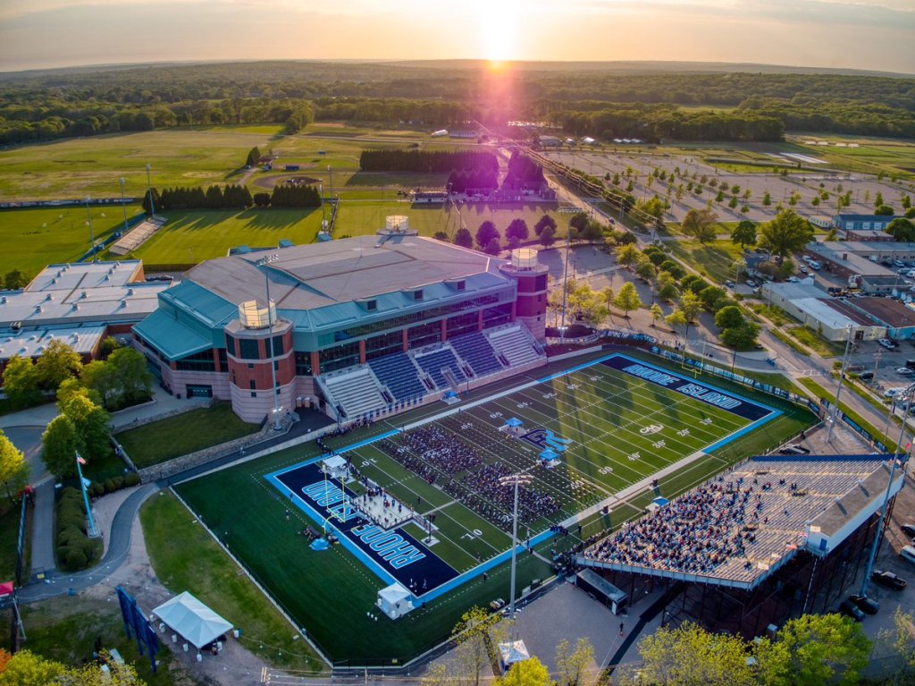 WMSB Take: Certainly unique, to say the least. One massive grand stand sits across from another smaller one that quite literally leans into another athletic facility. The gaping end zones on each side leave one wanting for more, but the lack of a track certainly helps Rhode Island’s case for legitimacy here. Either way, this is not the look of a prototypical football stadium, to say the least. A+ for uniqueness though.