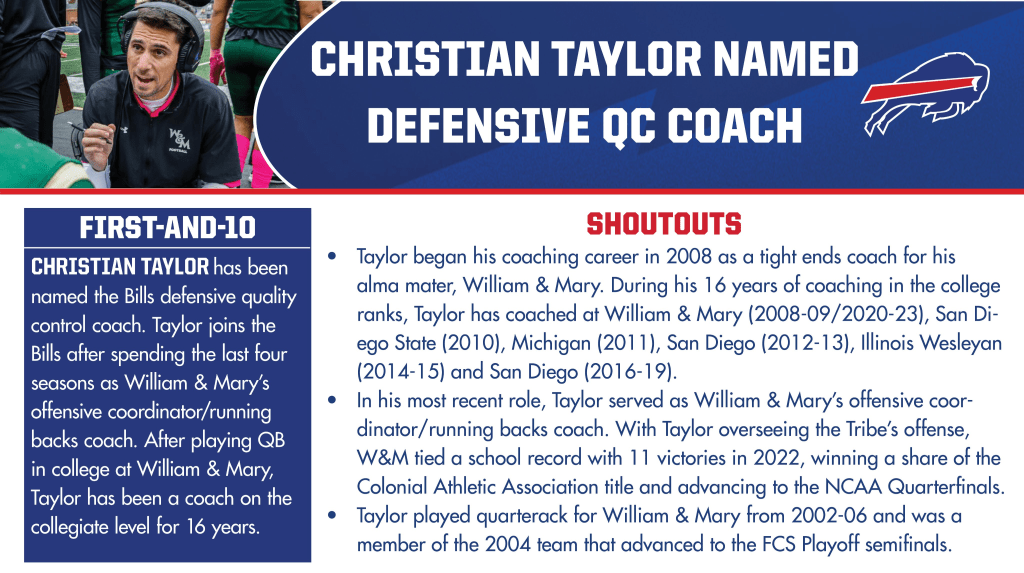 Few careers in football have been as well-traveled and well-earned as Christian Taylor’s. A former William & Mary quarterback turned coach, Taylor has carved out an impressive path in the coaching world, from his early years at his alma mater to leading record-breaking offenses at San Diego, and now to his current role with the Buffalo Bills.